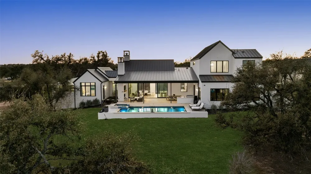 Ask about $50,000 landscaping allowance - Tucked away in the exclusive gated community of Madrone Canyon, this 4,882-squarefoot custom estate by Sendero is a seamless blend of modern luxury and Hill Country charm. Just minutes from the Hill Country Galleria, your new home offers an unparalleled lifestyle, where mornings begin with golden sunlight spilling through the trees and evenings wind down under a starlit Texas sky. The expansive lot welcomes you with mature landscaping and fast-growing oaks, promising a lifetime of shade and seclusion. Step inside to soaring arched ceilings adorned with driftwood-style beams, where natural light dances across wide-plank white oak floors. A 24-foot sliding glass wall seamlessly blends indoors and out, inviting fresh breezes inside. The gorgeous double kitchen is a chef’s dream, designed for both function and beauty. Gather around the oversized island, flanked by porcelain countertops, Thermador appliances, and three dishwashers designed for effortless entertaining. The primary suite is a true sanctuary, with a massive indoor/outdoor shower with steam unit —perfect for tranquil mornings or candlelit evenings. A deep soaking tub is perfectly positioned for breathtaking Hill Country views, turning your nightly unwind into a ritual of indulgence. With five bedrooms plus a dedicated office, four and a half baths, this home effortlessly balances space and intimacy. A movie theater and upstairs game room provide endless entertainment, while high-end designer touches such as custom wallpaper and tile accents bathrooms lend personality and elegance. Step outside to your fully fenced backyard oasis, where a heated pool and spa sparkle under the Texas sun. Fire up the grill in the outdoor kitchen, sip wine by the pool, or simply listen to the whispering oaks as the day fades to dusk. The paved driveway and oversized three-car garage, with its epoxy flooring and extra storage, welcomes you home with function and style.